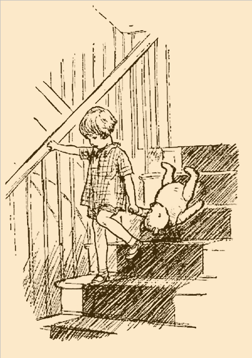 Here is Edward Bear, coming downstairs now, bump, bump, bump, on the back of his head, behind Christopher Robin. It is, as far as he knows, the only way of coming downstairs, but sometimes he feels that there really is another way, if only he could stop bumping for a moment and think of it. And then he feels that perhaps there isn't. Anyhow, here he is at the bottom, and ready to be introduced to you. Winnie-the-Pooh.